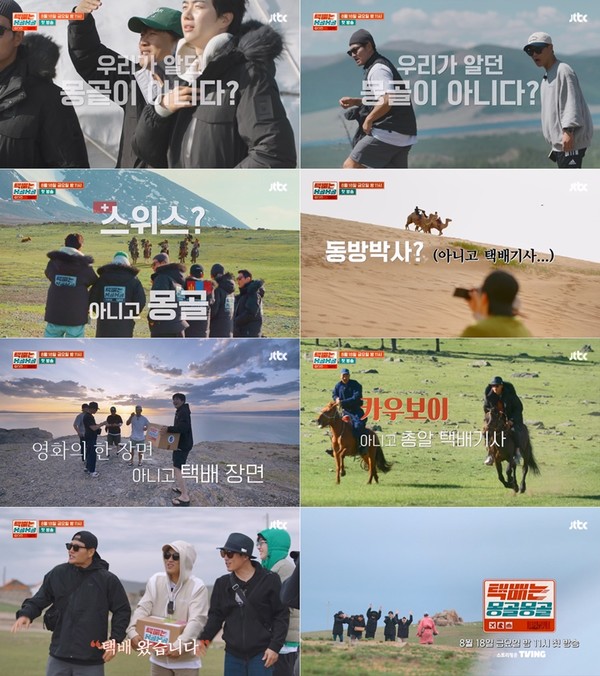 한편 김종국, 장혁, 차태현, 홍경민, 홍경인 그리고 강훈이 함께 하고 ‘유퀴즈’, ‘손 없는 날’의 김민석-박근형 PD가 연출하는 JTBC 신규 예능프로그램 ‘택배는 몽골몽골’은 오는 8월 18일(금) 밤 11시에 첫 방송될 예정이다.