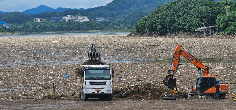 해마다 장마철이면 청풍호로 부유물이 밀려든다.