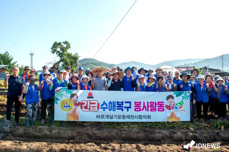 지난 22일 봉양읍 공전리를 방문한 바르게살기운동 제천시협의회(회장 김회원) 회원 70명은 수해로 인해 쓰러진 오이 농가의 지주대 철거 및 폐비닐 및 피해 농작물 수거 작업 등을 하며 복구 작업을 도왔다.