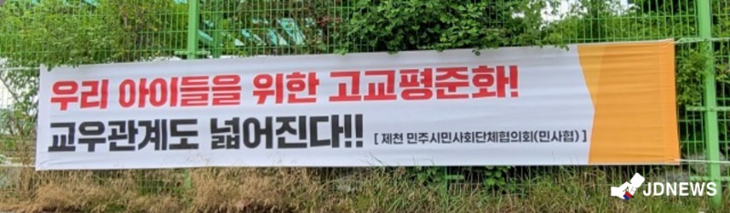 제천시내 곳곳에 고교 평준화를 응원하는현수막이 걸려있다.