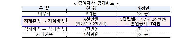 추 부총리는 “혼인신고일 전후 각 2년 이내 부모로부터 증여받은 재산에 대해서는 1억 원을 추가로 공제받을 수 있도록 해 전세자금 마련 등 청년들의 결혼관련 경제적 부담을 덜어주고자 한다”고 밝혔다.