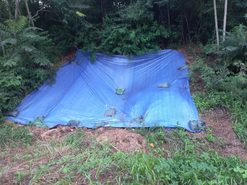 무너진 자리를 비닐과 천막으로 씌웠다.