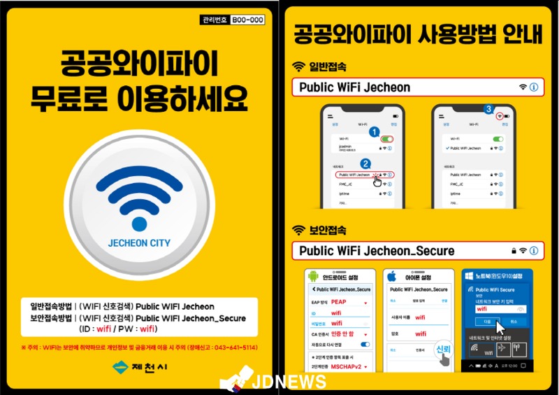 공공와이파이를 이용하기 위해서는 스마트폰 와이파이 기능을 켜고“Public WiFi Jecheon”을 선택해 사용하면 된다.