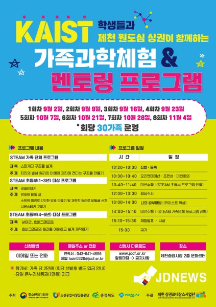 주요 프로그램 내용은 ▲(가족단체) 주제-지진 발생 원리의 이해와 지진에 견디는 구조물 만들기 ▲(초등부 1-3년) 주제-수학적 원리로 간단한 암호 만들기 및 과학적 원리로 비밀글 쓰기 ▲(초등부 4-6년) 주제-호버크래프트의 원리를 이해하고 설계 제작하기 등으로 구성되며, 매회 2명 이상의 KAIST 재학생들이 멘토로 참여할 예정이다.