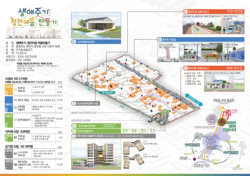주요사업으로는 청전이음 동행사업, 용두천 이음길, 청전생활 이음센터, 청전이음 빌리지로 20년 이상 된 노후 주택을 정비하고, 골목길 정비와 함께 주변 환경을 정리할 수 있게 되어 생활환경 개선이 이뤄질 것으로 기대하고 있다. 특히 주민 보행에 어려움을 겪게 하는 용두천로를 정비할 수 있게 되어 보행환경개선을 통한 주민 편의를 도모할 예정이다.