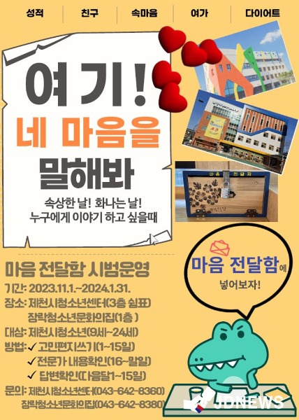 제천시 관계자는 “시범 운영을 통하여 마음 전달함의 위치와 운영 방법 등 청소년들이 마음을 편안하게 터놓고 이야기할 수 있는 창구를 마련할 것이며 추가 요청 시 관내 청소년시설로 확대 운영 예정이다.”라고 말했다.