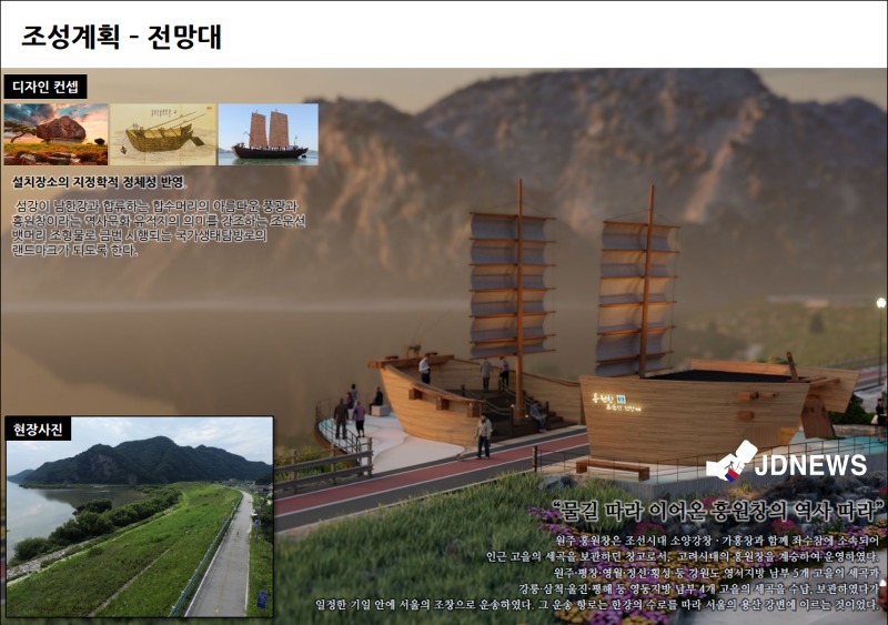 또한, 고려·조선시대 세곡 운송을 담당했던 흥원창의 역사적 가치를 모티브로 삼아 세곡 운반선인 조운선을 전망대 및 편의시설로 형상화해 설치한다.