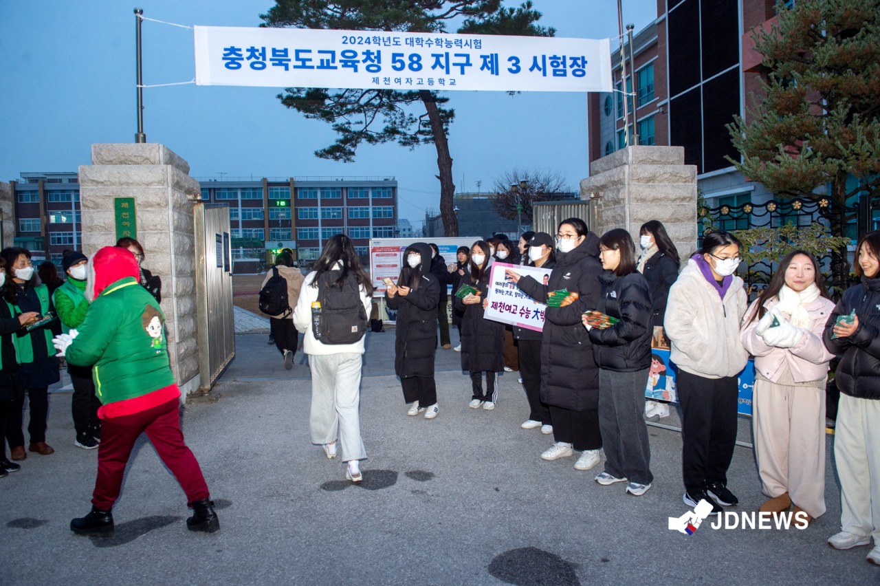 제천고등학교에 마련한 시험장 입구에서도 제천고 동문과 학부모들이 교사·학생들과 함께 수험생을 맞이하며 응원전을 펼쳤다.