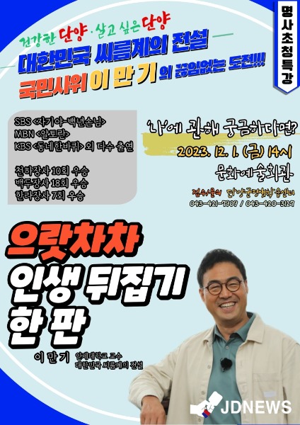 단양군은 이어 오는 12월 12일 라미경 서원대학교 교수의 ‘트렌드 읽거-메가시티 충청, 그리고 단양’과 12월 14일 강래경 한국강사협회 회장의 ‘행복을 자랑하지 말자’ 특강을 준비했다.