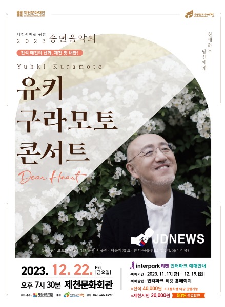 두번째로, 12월 22일 금요일 오후7시 30분에는 2023 제천시민을 위한 송년음악회 ‘유키구라모토 콘서트 Dear Heart’가 펼쳐진다.
