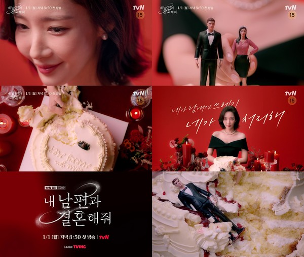 tvN 새 월화드라마 ‘내 남편과 결혼해줘’는 2024년 1월 1일(월) 저녁 8시 50분에 첫 방송된다.[사진 제공: tvN, tvN '내 남편과 결혼해줘' 티저 영상 캡처]