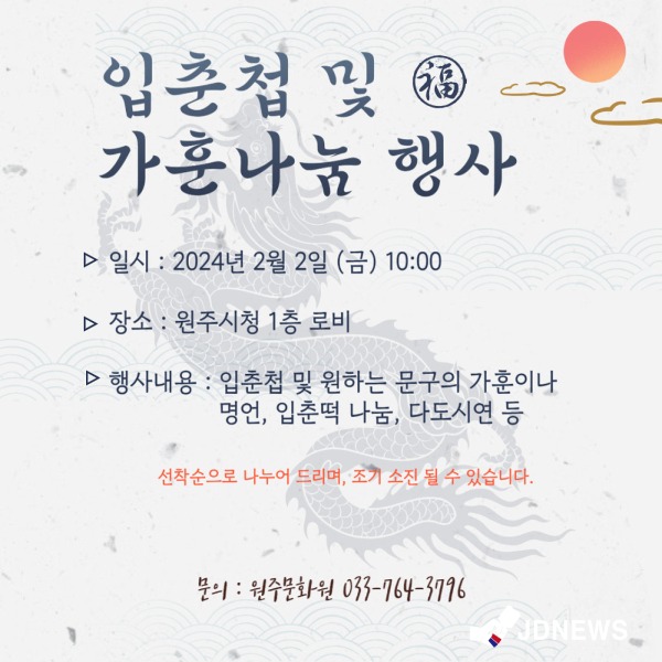 입춘(2월 4일)을 맞이해 시민의 무사안녕과 입춘대길을 기원하는 이번 행사는 유석기 강사 등 원주문화원 서예 강사들이 현장에서 입춘첩과 원하는 문구의 가훈 또는 명언을 직접 써서 무료로 제작·배포한다.