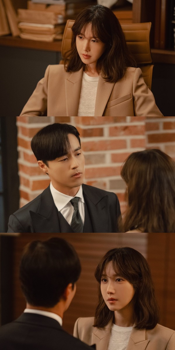 판세가 바뀔지 궁금증을 더하는 가운데 '솔루션' 사무실에 찾아간 노율성의 모습이 포착돼 시선을 끈다. 사진 속 노율성은 굳은 표정과 서늘한 눈빛으로 김사라를 응시하고 있는 반면 김사라는 노율성의 시선에도 당당함을 잃지 않는다.