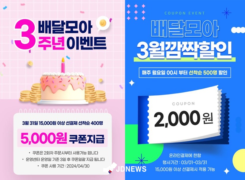 또한 3월부터 배달앱 내‘소모임’시상식도 시작한다. 매달 결제누적금액 상위 1~5위에게 최대 40만원까지 시상금을 마일리지로 지급할 예정으로 배달모아 활성화에 박차를 가할 것으로 보인다. 여기서‘소모임’이란 배달모아 소모임 카테고리에서 친구‧지인들과 모임을 개설하면 주문금액을 자동 합산해 주는 시스템이다.