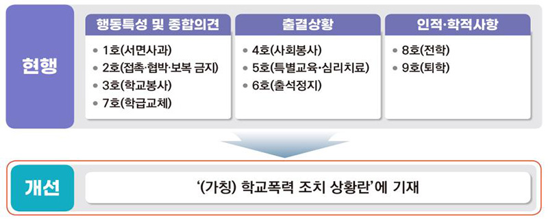 이전에는 학교폭력 조치 사항을 학생부 내 ‘출결상황 특이사항’, ‘인적·학적 특기사항’, ‘행동 특성 및 종합의견’란에 분산 기재되던 것이 앞으로 체계적으로 관리되는 것이다.