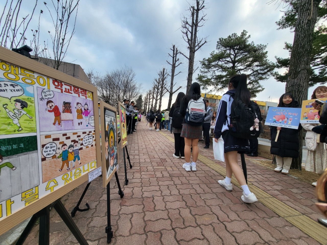 또 이번 캠페인에서는 학교폭력의 위험성과 학교폭력 신고요령에 대한 홍보와 함께 지난달 학교폭력예방 포스터 공모전에서 당선된 작품 12점을 교내에 전시하여 학생들이 학교폭력 근절에 대해 다시 한번 관심을 갖을 수 있는 기회를 마련하였다.
