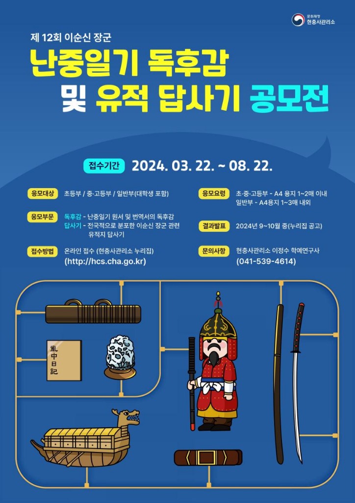 공모전에 관한 자세한 사항은 문화재청 누리집(www.cha.go.kr)과 현충사관리소 누리집을 참고하면 된다.