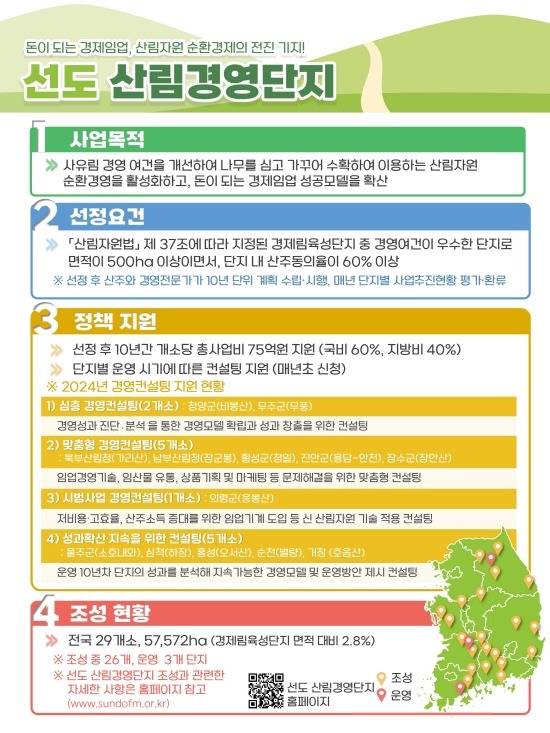 ‘선도 산림경영단지’는 산림청장이 지정한 경제림육성단지 중 경영 여건이 우수한 곳을 대상으로 공모해 선정하며, 선정 시 지역 산림조합 등 전문 경영인에 의해 10년간 임도(林道), 조림(造林)·숲가꾸기 등 산림자원 순환경영 활성화를 위한 사업을 집중적으로 추진하는 정책이다.
