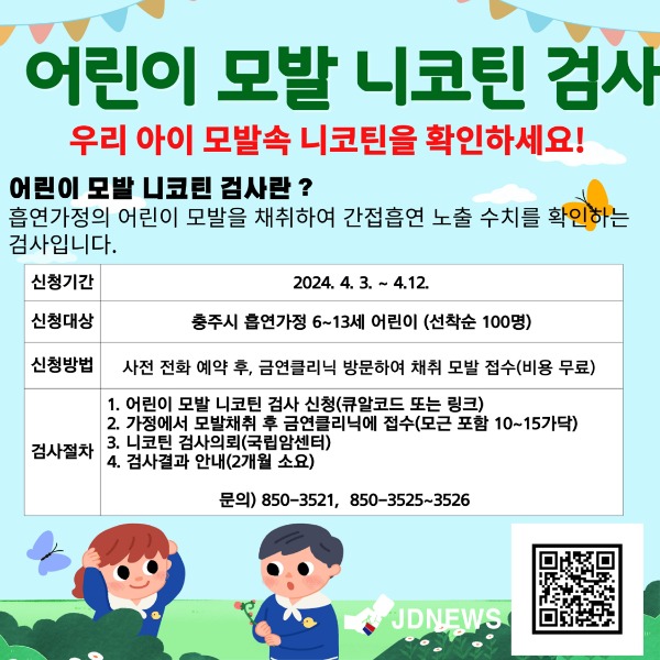 보건소는 4월 3일부터 12일까지 관내 영·유아 및 초등학생 중 흡연자 가족이 있는 어린이 선착순 100명을 대상으로 충주시 보건소 홈페이지 큐알코드 및 링크를 통해 검사 신청을 받는다.