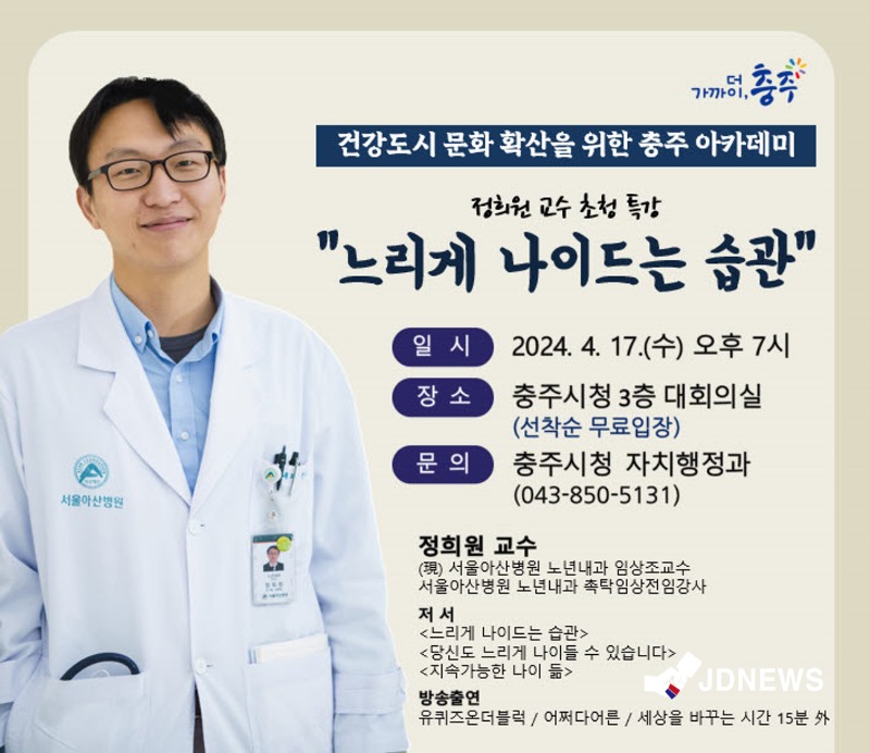 조길형 충주시장은 “100세 시대 느리게 나이 드는 습관을 통해 건강한 노후를 준비할 수 있도록 이번 특강을 준비하였으니 시민들의 많은 참여를 바란다”며, “앞으로도 누구나 체감하는 지속가능한 건강도시를 조성하기 위해 노력하겠다”고 말했다.