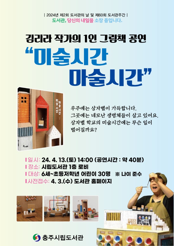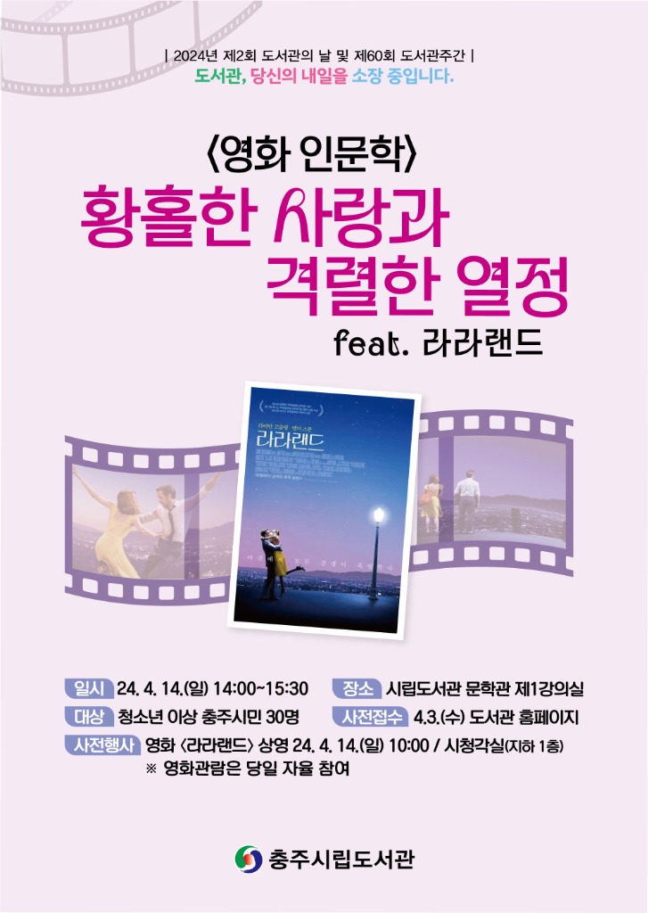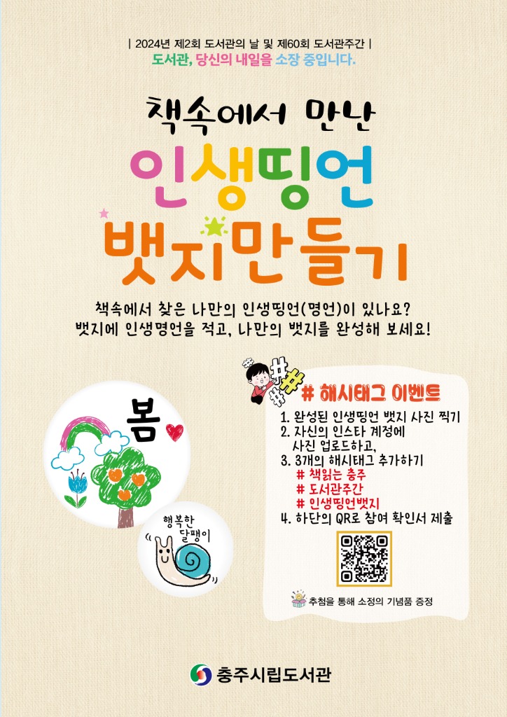 충주시립도서관은 제2회 도서관의 날(4.12) 및 도서관 주간(4.12-18)을 맞이하여 ‘도서관, 당신의 내일을 소장 중입니다’라는 주제로 오는 12일부터 18일까지 다양한 독서문화행사를 추진한다고 밝혔다.