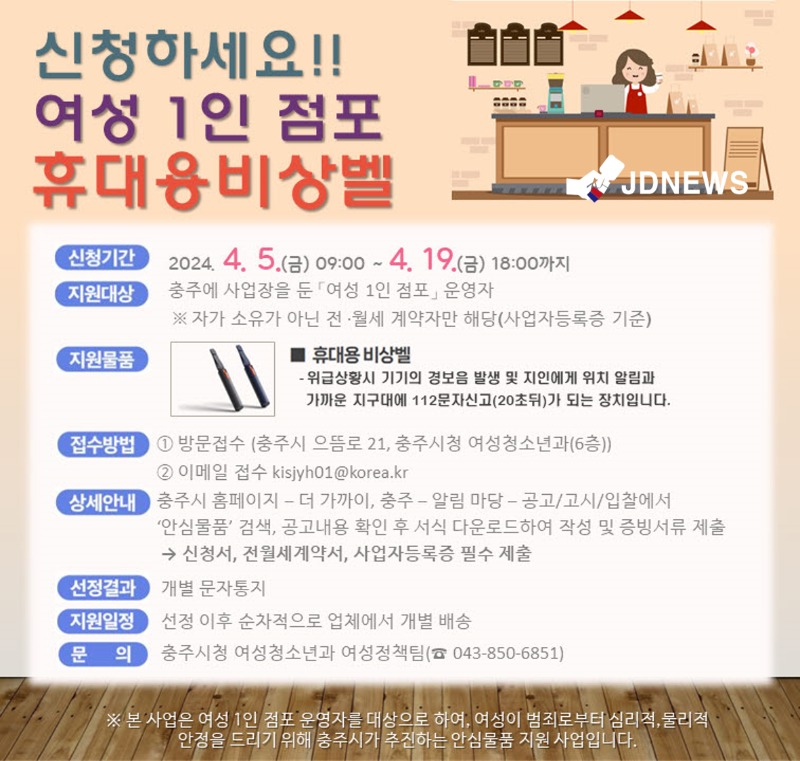 시는 이미용업, 카페, 피부 관리샵, 옷 가게 등 여성 1인 소규모 점포 사업주들의 안전한 가게 운영을 도모하고자 지난 3월 4일 충주경찰서와 휴대용 비상벨 지원, 위기 상황 발생 시 경찰력 동원 등 피해자 보호를 위한 업무 협약을 체결한 바 있다.