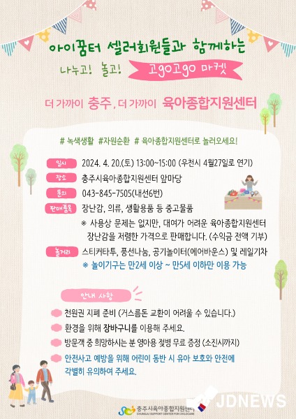 특히, 센터 장난감 도서관(아이꿈터) 회원 가족 10팀이 판매자로 참여해 가정에서 사용하지 않는 장난감, 작아진 옷, 신발 등 육아용품과 사용상 문제는 없지만 대여가 어려운 센터의 장난감 및 우리 지역 농산물도 저렴한 가격으로 판매할 예정이다.