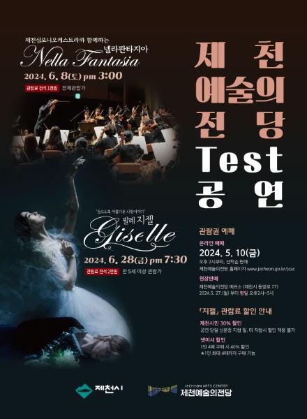 2차 테스트 공연은 인천시티발레단의 ‘지젤’발레 공연으로 6월 28일, 오후 7시 30분에 진행되며 관람권은 전석 2만 원이다. ‘지젤’관람권은 전석 2만원이며 제천시민은 30% 할인, 1인이 4매를 한 번에 구매할 경우 관람권을 40% 할인해준다.