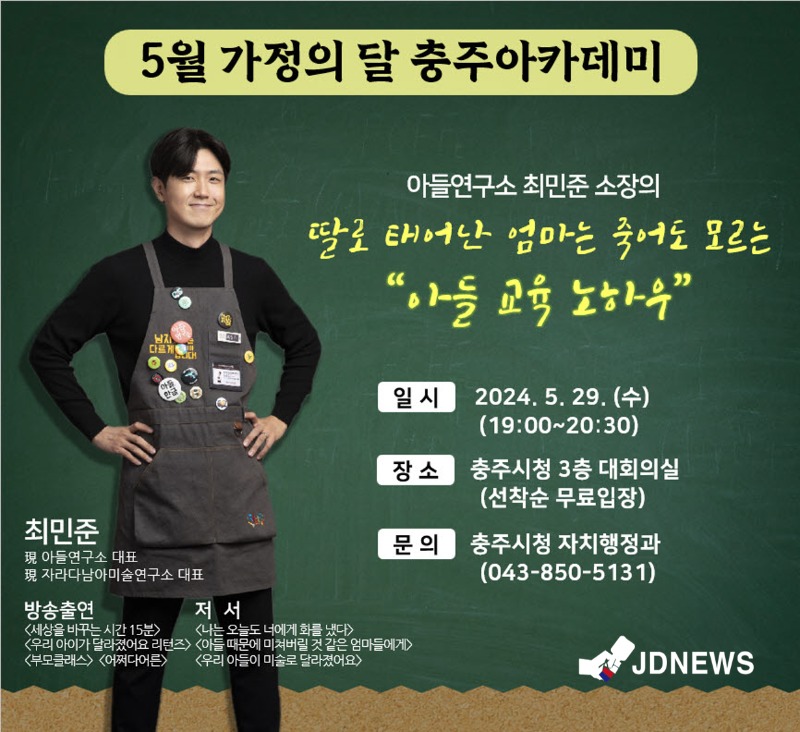 시 관계자는 “가정의 달을 맞이하여 육아에 지친 부모들에게 도움을 주고, 나아가 부모와 아이가 모두 행복하고 건강한 충주시를 만들기 위하여 이번 아카데미를 준비했다”며 “많은 시민이 참여하여 유익한 시간 보내시길 바란다”고 말했다.