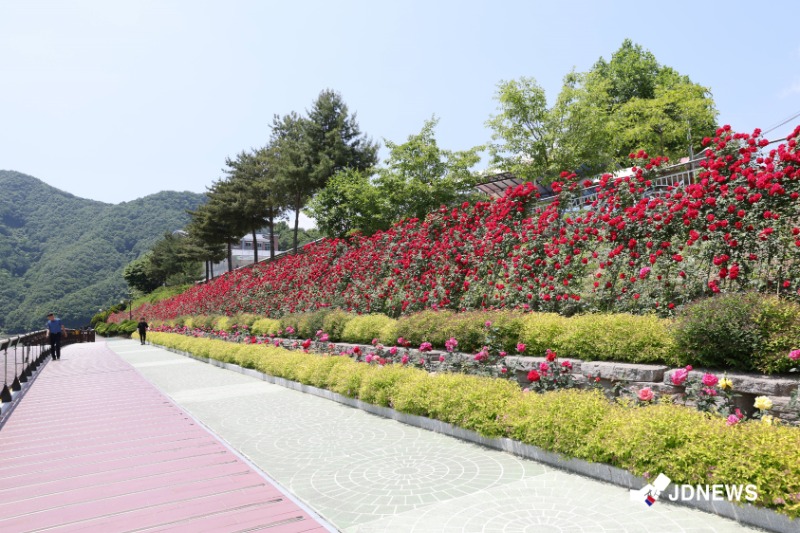 수많은 장미가 아름답게 피어나 남한강 주변을 붉게 수놓은 풍경은 방문객들의 감탄을 자아내고 있다.