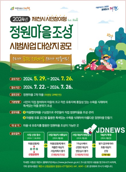 제천시는 서류 및 현장 심사를 통해 사업에 대한 사전 준비도, 사업계획 타당성, 기대효과, 실현 가능성, 유지관리 방안 등을 종합적으로 평가한 후 8월 중 최종 사업 대상지를 확정할 예정이다. 자세한 내용은 제천시 홈페이지(https://www.jecheon.go.kr) 고시공고란에서 확인할 수 있다.