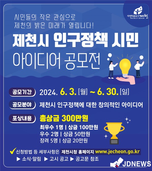 공모전 접수는 6월 3일부터 30일까지 진행되며 제천시민 누구나 응모가 가능하다. 공모분야는 ▲임신․출산 ▲저출산 대응 ▲정년정착․유입 ▲정주여건 개선 ▲생활인구 증가 ▲기타 인구시책과 관련된 모든 분야이다.