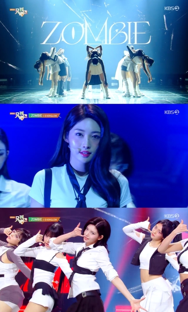 에버글로우(이유, 시현, 미아, 온다, 아샤, 이런)는 21일 방송된 KBS 2TV ‘뮤직뱅크’에 출연해 다섯 번째 싱글 앨범 ‘ZOMBIE(좀비)’의 타이틀곡 ‘ZOMBIE’ 무대를 선보였다.