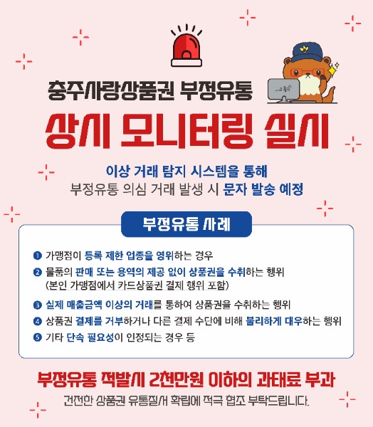 충주시가 건전한 충주사랑상품권 거래 질서 확립을 위해 '충주사랑상품권 이상거래 탐지 시스템 및 부정유통신고센터를 활용한 상시 모니터링’을 실시한다.