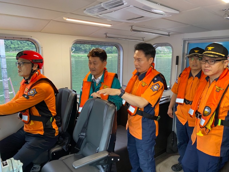 이날 수난구조대를 방문한 오영탁 도의원은 주요업무를 보고받고, 소방정에 탑승해 주요 수계구역 시찰과 수난구조장비를 확인했다.