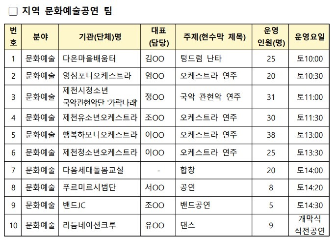지역문화예술공연 참여팀은 제천교육지원청이 모집한 문화예술분야 단체들로 10개 업체이다.