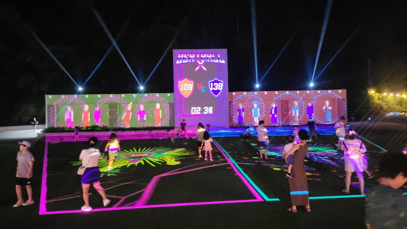 실외공간은 운동장에 초고화질의 상호작용 미디어파사드를 조성해 관람객 동작에 따라 움직이는 AI 디지털 캐릭터, 인터렉티브 파도, 미디어 축구 등으로 관람객들에게 이색 체험을 제공하고 있다.