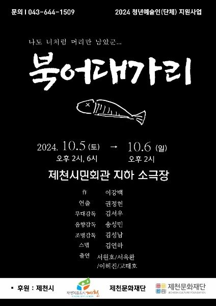 연극 북어대가리가 10월 5일과 6일, 제천시민회관 지하 소극장에서 무료로 공연된다.