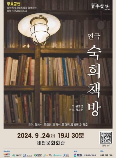 청년극장(대표 이윤혁)이 오는 2024년 9월 24일 화요일 오후 7시 30분, 제천문화회관에서 연극 숙희책방을 무료로 공연한다.