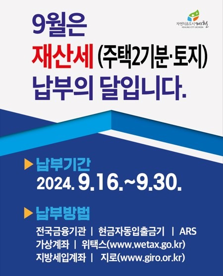 시 관계자는“9월 30일 이후에 납부하면 3%의 납부지연가산세를 추가로 부담하게되므로 기한 내에 납부해 주시기 바란다.”고 당부했다.