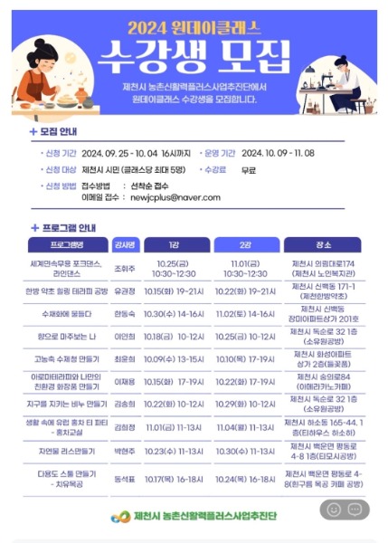 제천시 농촌신활력플러스사업추진단에서 2024 원데이 클래스 수강생을 모집한다.