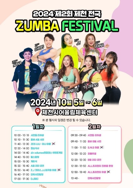 행사 첫날에는 오전 10시부터 줌바 시연이 펼쳐지며, 오후에는 ZES™ NANA의 특별 공연이 예정되어 있다. 또한, 다양한 이벤트 게임과 DJ 파티, 랜덤댄스 등 참여형 프로그램도 함께 마련되어 있다.