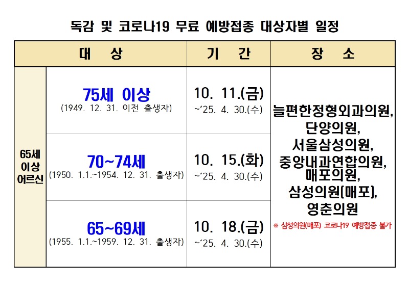 75세 이상(1949년 이전 출생)은 지난 11일부터, 70∼74세(1950∼1954년생)는 오는 15일부터 65∼69세(1955년∼1959년생)는 오는 18일부터 관내 위탁의료기관에서 접종이 가능하다.