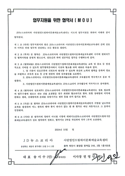 이번 협약을 통해 드림하이문화예술교육센터는 JD뉴스코리아의 언론 및 교육 활동에 적극적으로 참여하게 되며, JD뉴스코리아는 드림하이문화예술교육센터의 교육 및 예술 활동을 홍보하는 데 적극적으로 지원하기로 했다.