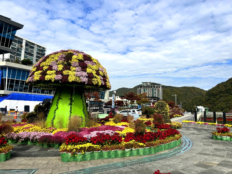 특히 다누리센터 앞에는 다양한 색상의 댑싸리와 그라시로 수놓은 국화 꽃다발 작품이 설치되어 관광객들의 시선을 사로잡고 있다.