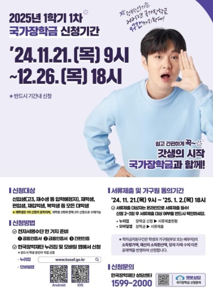 한국장학재단이 2025학년도 1학기 1차 국가장학금 신청 기간을 11월 21일(목) 오전 9시부터 12월 26일(목) 오후 6시까지로 발표했다.
