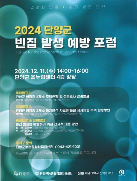 단양군은 오는 11일 올누림센터 4층 강당에서 ‘2024년 단양군 빈집발생예방 포럼’을 개최한다고 밝혔다.