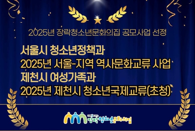 장락청소년문화의집이 2025년 서울시 청소년정책과 주관 사업인 ‘서울-지역 역사문화교류 사업’과 제천시 2025 청소년활동 공모사업 중 ‘청소년 국제교류(초청) 공모사업’에 선정되었다.