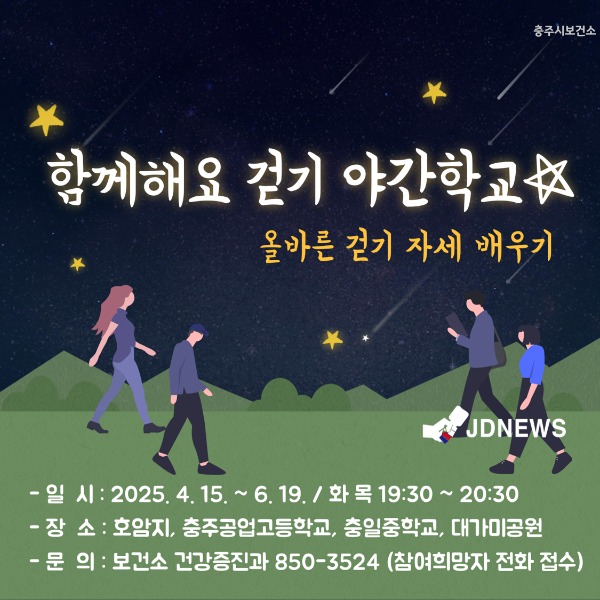 걷기 야간학교는 충주시 걷기 지도자를 강사로 활용해 시민 다수가 모이는 장소인 호암지, 공업고등학교, 충일중학교, 대가미공원 총 4곳에서 매주 저녁 7시 30분부터 8시 30분까지 1시씩 진행된다.