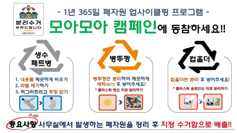‘모아모아 캠페인’은 일상생활 속에서 발생되는 투명 페트병, 컵 홀더, 플라스틱 병뚜껑을 직원들이 직접 분리하고 제천시 자원봉사센터에서 수거하는 방식으로 진행되며, 모아진 폐자원은 업사이클링을 통해 치약짜개, 키링, 생활 필수품 등 친환경 제품으로 재활용될 예정이다.